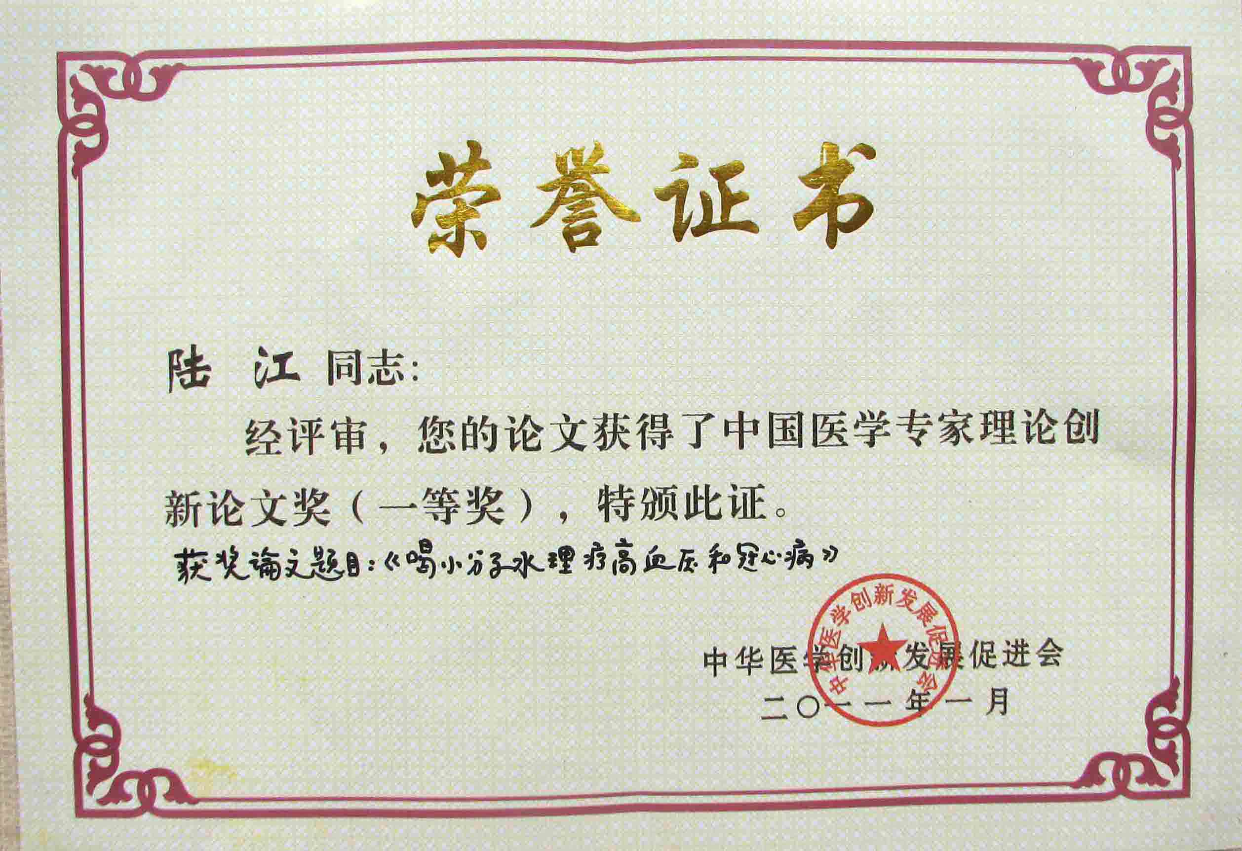 新疆63歲的賀兆生飲用一年,冠心病未愈,他用電話介紹是食堂管理員,問他食量多少?說吃七八分飽,睡前還吃兩袋牛奶,陸 江說我在論文和書中多次批判“吃七八分飽”,關(guān)照患者務(wù)必用“己饑方食”控制主食肉食量,要他把牛奶改在早中餐吃,減少主食肉食量,建議不吃晩餐,晚上只吃一個蘋果,再經(jīng)幾個月補水節(jié)食,治愈了21年的冠心病和肥胖、失眠等病,信中由衷地感激陸 江為再生父母。[13]因為醫(yī)生從未過問他的膳食習(xí)慣,只管開處方藥或手術(shù),父母也不會叫他不吃晩飯。