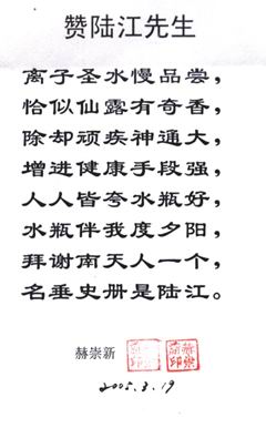 新疆63歲的賀兆生飲用一年,冠心病未愈,他用電話介紹是食堂管理員,問他食量多少?說吃七八分飽,睡前還吃兩袋牛奶,陸 江說我在論文和書中多次批判“吃七八分飽”,關(guān)照患者務(wù)必用“己饑方食”控制主食肉食量,要他把牛奶改在早中餐吃,減少主食肉食量,建議不吃晩餐,晚上只吃一個蘋果,再經(jīng)幾個月補水節(jié)食,治愈了21年的冠心病和肥胖、失眠等病,信中由衷地感激陸 江為再生父母。[13]因為醫(yī)生從未過問他的膳食習(xí)慣,只管開處方藥或手術(shù),父母也不會叫他不吃晩飯。