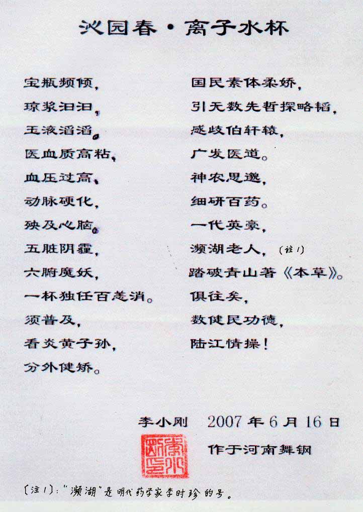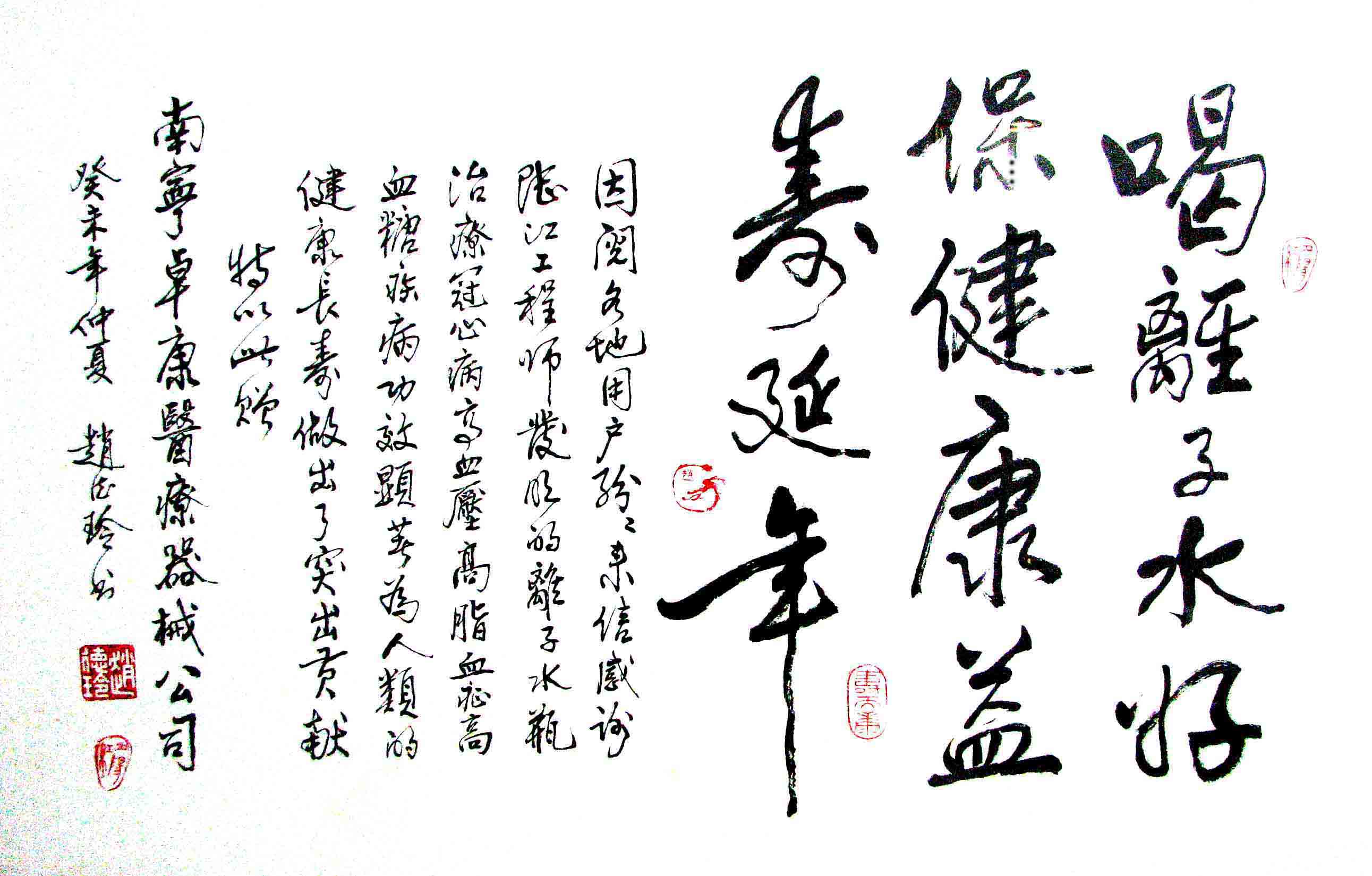 -----我是從事建筑的高工,本來沒有資格去攻克醫(yī)學(xué)難題,卻為了自身健康才扣響醫(yī)學(xué)的大門。由于我1990年患高血壓,因怕中風(fēng)才研究發(fā)明了離子水瓶,我把水處理成微小分子團水,飲用后治愈了高血壓。便于1993年底送到三家省級醫(yī)院做臨床試用4個月。經(jīng)北京和廣西醫(yī)學(xué)專家鑒定:"降脂降壓效果好"," 能擴大心腦動脈流量,改善心腦電圖以及微循環(huán)","對治療心腦動脈粥樣硬化、高血壓、高血脂有良好的醫(yī)療保健作用。""產(chǎn)品的技術(shù)性能和療效達到了同類產(chǎn)品的國內(nèi)領(lǐng)先水平,經(jīng)廣西醫(yī)學(xué)科學(xué)情報研究所檢索,未見國外有類似報道。"中國醫(yī)學(xué)科學(xué)院張正國教授從美國國立醫(yī)學(xué)圖書館數(shù)據(jù)庫存Medline檢索英俄文資料,均未見類似報告。2000年上市后,我為了對消費者負責(zé)而繼續(xù)觀察研究,一直通過《信譽卡》和《質(zhì)量跟蹤調(diào)查書》向患者承諾療效,請用戶使用6個月后反饋效果。和脂壓患者飲用2至5個月內(nèi),消除癥狀,停服藥物,血壓正常;冠心病患者飲用3~5個月逐漸減輕至消除心絞痛、房顫等癥狀,不再服藥,飲用1年左右心電圖正常,經(jīng)冠脈造影掃描無明顯狹窄,表明冠心病痊愈。大量患者還反映許多衰弱器官被修復(fù),讓前列腺增生、慢性咽喉炎、慢性氣管炎、支氣管炎、慢性胃炎、腸炎和膽囊炎等不藥而愈;2型糖尿病患者是因為胰島衰弱致病,飲用該水半年至一年,逐漸減藥至停藥,血糖尿糖正常,真正治愈2型糖尿病。中風(fēng)后遺癥患者飲用六七個月,可逐漸減輕至消除肢體和語言障礙,表明飲用該水能讓壽命很長的神經(jīng)元細胞逐漸修復(fù),奇跡般地恢復(fù)肢體和語言功能。飲用后還使胸腺和脾臟兩個重要的免疫器官被修復(fù)和增強,產(chǎn)生免疫細胞多,提高了免疫力,使人不生病或少生病。自此, 飲用微小分子團水創(chuàng)造了攻克冠心病、高(低)血壓和糖尿病三大醫(yī)學(xué)難題的奇跡。人們對此感到不可思議,但實踐是檢驗真理的唯一標準。