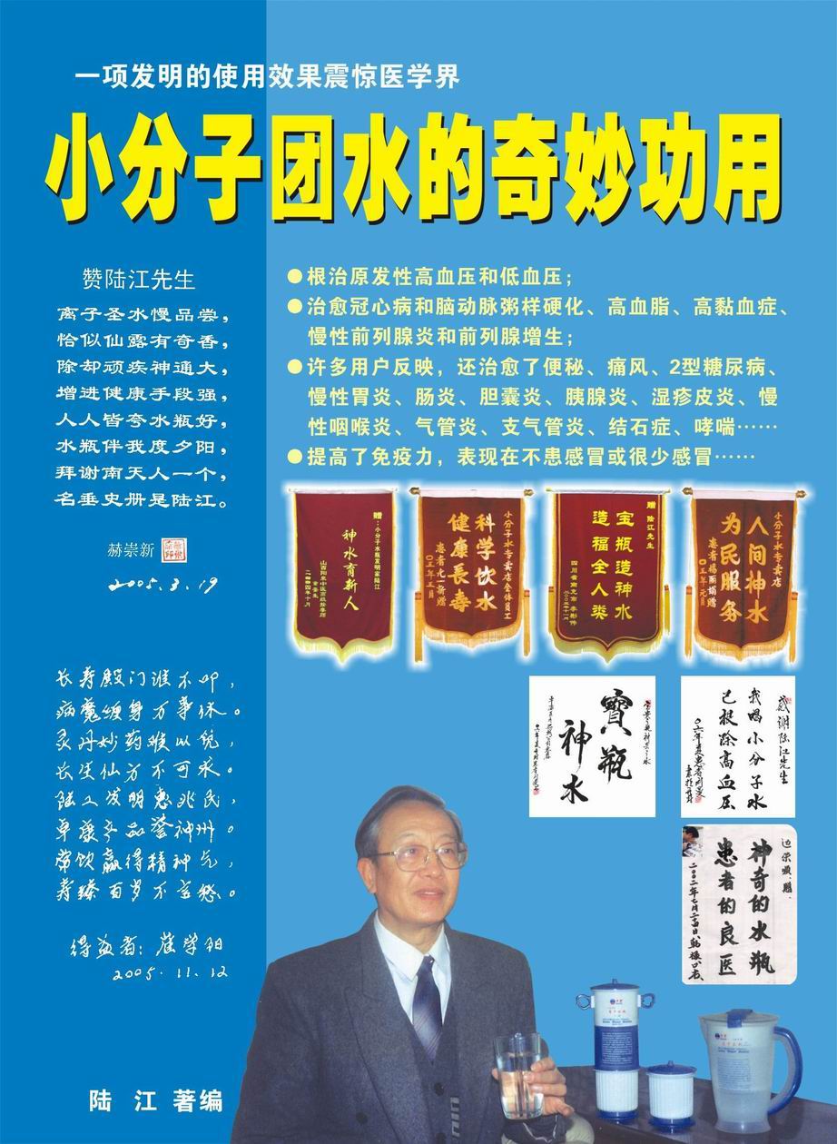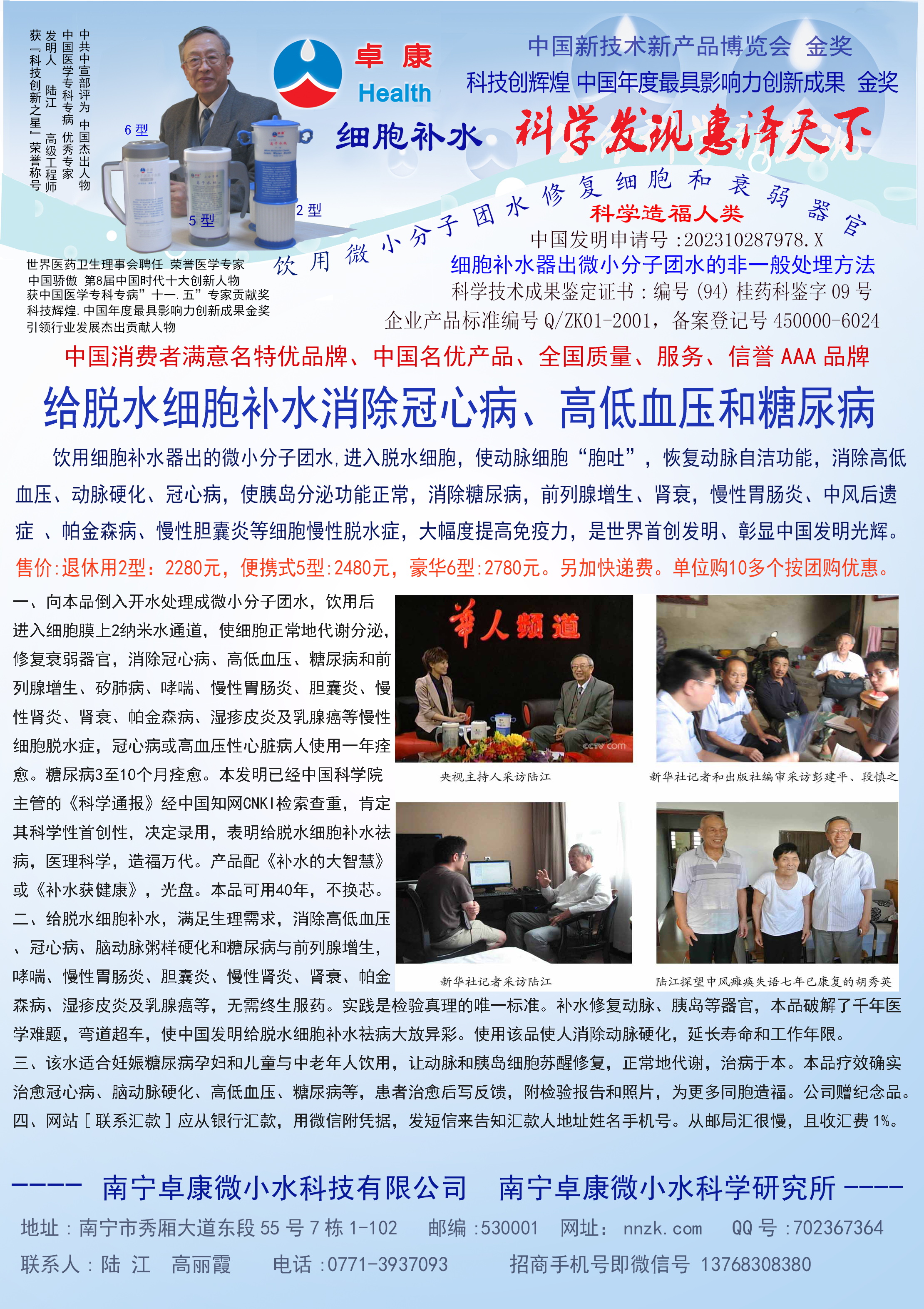 人類幾千年來患以上病癥需終生服藥,幾十年也不能治愈??墒俏覈蠈幍母呒壒こ處熽?nbsp;江,于1990年想根治高血壓,研究發(fā)明了離子水瓶,處理出微小分子團水供飲用,經(jīng)過醫(yī)院臨床試用和專家鑒定,1999年獲中國發(fā)明專利權(quán),產(chǎn)品于2000年投放市場后一直跟蹤調(diào)查,據(jù)全國各地用戶反饋:祛除了高低血壓、糖尿病和冠心病,并使前列腺增生、咽喉炎、鼻竇炎、慢性氣管炎、支氣管炎、矽肺病、哮喘、慢性胃炎、腸炎、慢性膽囊炎、慢性腎炎、腎衰、膀胱炎、便秘、痔瘡、風(fēng)濕性關(guān)節(jié)炎和濕疹皮炎及中風(fēng)后遺癥等病癥不藥而愈。為什么喝微小水能治20多種病?陸 江從1991年德國科學(xué)家發(fā)現(xiàn)細胞膜水通道僅為2納米獲得啟發(fā),認為多種器官患病是因細胞脫水,不能正常代謝和分裂增殖,才使器官細胞減少致衰弱萎縮而形成細胞缺水性病癥。22年來的實踐有力地支持了“細胞脫水致病”這一重要論點,表明喝微小水可滿足細胞的生理需求,補水就能祛病,是生命科學(xué)新亮點。
