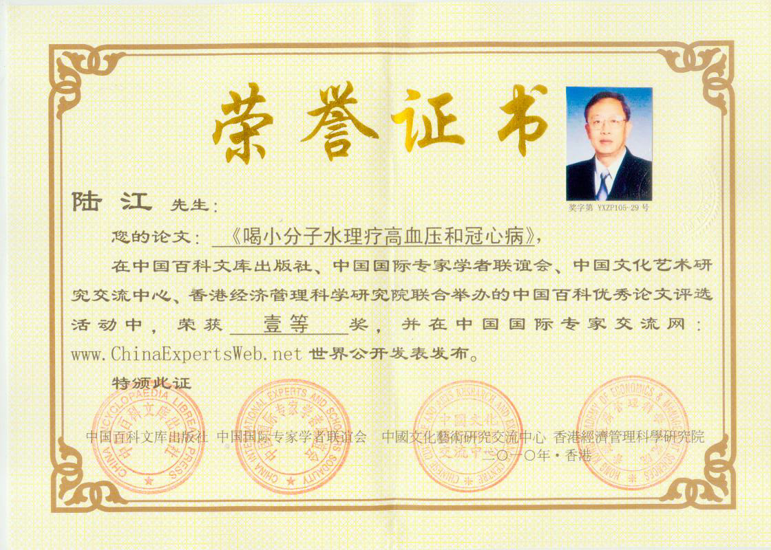 一.發(fā)明的亮點是中國基礎(chǔ)醫(yī)學(xué)研究成果的轉(zhuǎn)化醫(yī)學(xué)應(yīng)用------------------------------------------------------------------------------------ 1990年春,我50歲,發(fā)現(xiàn)患了高血壓,便及時遵醫(yī)囑服藥。我想起父輩、祖輩曾患高血壓,后來都患中風(fēng)癱瘓或心梗過世,所以心中壓力大。我夢想能根治高血壓,便研究醫(yī)學(xué)。當(dāng)我檢索到中國基礎(chǔ)醫(yī)學(xué)研究成果,采用高脂餐和磁處理小分子團水飼喂小白鼠或大白免等兩組哺乳動物,經(jīng)過2、4、6個月剖殺血檢,發(fā)現(xiàn)飼喂小分子團水的試驗組動脈內(nèi)壁干凈,能減輕和延緩動脈粥樣硬化。我從這些研究成果受到啟發(fā)。覺得有責(zé)任研制出優(yōu)良的器具,讓天下人能真正治愈高血壓,消除動脈粥樣硬化,延年益壽。于是,1990年我做成樣品,先后與愛人飲用兩三個月,分別治愈了高、低血壓,之后我們的血壓都正常,癥狀消失。該水經(jīng)南京大學(xué)做核磁共振檢測為55.82赫茲的微小分子團水。該品經(jīng)工業(yè)開發(fā)后,1994年送給廣西三家三甲醫(yī)院做臨床試用4個月,再經(jīng)北京和廣西醫(yī)學(xué)專家鑒定認為:“降脂降壓效果好” ,“能擴大心腦動脈流量,改善心腦電圖和微循環(huán)” ,“對治療心腦動脈粥樣硬化、高血壓、高血脂有良好的醫(yī)療保健作用”。1996年產(chǎn)品獲得中國發(fā)明專利權(quán)。這就使產(chǎn)品可以轉(zhuǎn)化為醫(yī)學(xué)應(yīng)用,人類可逐漸改變終生服藥,自己祛除病癥。